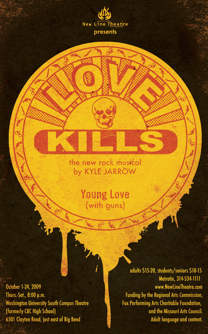 Kyle Jarrow's Love Kills might just be the most intense, ballsiest piece of theatre I've ever encountered. A four-character walpurgisnacht unfolding almost in real time, it follows two (real-life) teenage spree murderers in the over-night custody of a Nebraska sheriff and his wife, in 1958. The score is an explosion of raw emo rage and deeply felt pain, regrets and delusions, and even a sort of redemption. It's apparently too raw and ugly for the New York commercial theatre to dare, but it is one of the coolest shows I've ever worked on in my life. New Line presented the world premiere of Love Kills in 2009 and got rave reviews for it. There have been a few more productions since then, but not as many as this show deserves. If anybody's ballsy enough to take this one on, you can reach Kyle through his website.